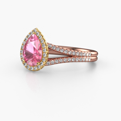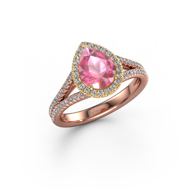 The ring shown above is called the Verla pear 2. We call this type of ring a halo ring because it has one centre gemstone and a band that is also pave set with gemstones. The 14 Carat rose gold engagement ring is set with a pear 8x6 mm pink sapphire centre stone and the band is pave set with diamonds. What makes this exclusive rose gold halo ring special are the smaller sized stones embracing the centre stone. This gorgeous engagement ring is called a halo ring because the smaller gemstones give the centre stone a halo of surrounding light. In order for the smaller stones to enhance the centre stone, they have to be placed so there is no interference of light. And that's when our expert goldsmiths come in. Each individual stone is carefully set in the ring by hand. During manufacturing, light fall is constantly monitored to make sure the special halo is still visible. In the end you get a unique engagement ring, with a pink sapphire of your choosing at its centre. You can imagine the effect of a ring of such significance when you give it to her on her special day to shine. After receiving your order, our goldsmiths will passionately start the creative process of making your engagement ring in our own studio. Because we don't have a big stockpile, these costs will not be passed on to you. Our pricing is proof of that! We offer top quality jewels at lowest price, guaranteed.Our designers and goldsmiths work together each day, creating new jewels. Perhaps you have found a nice exclusive engagement ring somewhere, which can be used to customize your unique ring. Please feel free to contact us. We will make you an offer, based on a fair price/ quality ratio, which will amaze you.To make it easier for you, we offer a 30 day return policy. Check our terms and conditions.