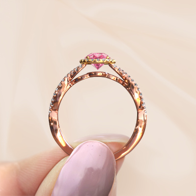This 14 Carat rose gold ring is called Dionne pear and is set with 7x5 mm pink sapphire. Does your girlfriend fancy exclusive jewellery? Or would you like to show her that she deserves the finest jewellery? This rose gold ring is pure craftsmanship, love and passion combined with the latest techniques coming together in perfect harmony. It requires a keen eye, patience and a skilful hand to mould this ring into perfection. Just the job for our expert goldsmith! The pink sapphire set gemstones gives this rose gold ring an extra glamorous appearance. Customize the style of the twist engagement ring to her liking with a wide variety of precious metals and gemstones which you select. That is how you create a unique ring for the most exclusive woman in your life! This jewel is created to add sparkle to your finger, each jewel is lovingly made by hand by our goldsmiths.Are you on a budget? Please feel free to contact us, so we can go discuss your options. We offer our engagement rings at guaranteed best price, because we make them to order. You won't find such a price anywhere else!Different styles of new rings are made daily by our team. Perhaps you have found a pavé solitaire engagement ring somewhere. One you would like to give to your loved one. Please feel free to share your thoughts and design with our jewel designers. We would love to turn your design into a exclusive engagement ring. You can follow the development of your ring design because we use very detailed 3D drawings. On top of that, you can order a dummy of the design. A dummy is a plastic ring, which can be shaped according your ring design. You can try it on and check if the engagement ring is up to standard. We will gladly send you a non-binding offer, based on a fair price/ quality ratio. The offer will baffle you, considering the quality of the ring and gemstones.To make it easier for you, we offer a 30 day return policy. Check our terms and conditions.