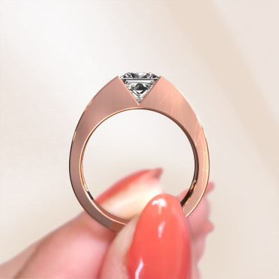 This 14 Carat rose gold ring is called Arlena 2 and is set with 1.00 crt diamond. This modern rose gold Engagement ring is a true masterpiece! Our expert goldsmith uses special techniques during crafting of this tension set ring to make sure the diamond of this rose gold ring is fixed properly. The effect is that light fall reflects beautifully on the gemstone, which gives the ring its maximum shine and glamorous appearance. The result is a unique ring, with a trendy appearance, passionately handcrafted to perfection by our artisan goldsmith. A one-of-a-kind ring, designed for the love of your life! This jewel is unique in every way! Simply customize to your likingBy using our modern techniques, we can design and customize the finest quality jewels with the utmost care for you. Our Engagement rings are always priced 30 percent lower than other jewellers. We make Engagement rings to order so we don't have to maintain a large stock. If you have a certain budget, we are more than happy to advice you accordingly.Have you found a specific Engagement ring somewhere which you would like to give to your loved one? Please feel free to express your wishes to our jewel designers because we would be honoured to turn your design into a modern Engagement ring. You can follow the development of your ring design because we use 3D drawings. This gives you a realistic preview of how your design will look. You can also preorder a dummy. A dummy is a plastic ring, which can be shaped according your ring design. You can try it on and check if its width and size are suitable for you. We will gladly send you a non-binding offer, based on a fair price/ quality ratio. It will amaze you, considering the quality of the ring and gemstones.To make it easier for you, we offer a 30 day return policy. Check our terms and conditions.