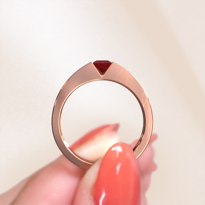 This 14 Carat rose gold ring is called Arlena 2 and is set with 4 mm ruby. This modern rose gold Engagement ring is a true masterpiece! Our expert goldsmith uses special techniques during crafting of this tension set ring to make sure the ruby of this rose gold ring is fixed properly. The effect is that light fall reflects beautifully on the gemstone, which gives the ring its maximum shine and glamorous appearance. The result is a unique ring, with a trendy appearance, passionately handcrafted to perfection by our artisan goldsmith. A one-of-a-kind ring, designed for the love of your life! This jewel is unique in every way! Simply customize to your likingBy using our modern techniques, we can design and customize the finest quality jewels with the utmost care for you. Our Engagement rings are always priced 30 percent lower than other jewellers. We make Engagement rings to order so we don't have to maintain a large stock. If you have a certain budget, we are more than happy to advice you accordingly.Have you found a specific Engagement ring somewhere which you would like to give to your loved one? Please feel free to express your wishes to our jewel designers because we would be honoured to turn your design into a modern Engagement ring. You can follow the development of your ring design because we use 3D drawings. This gives you a realistic preview of how your design will look. You can also preorder a dummy. A dummy is a plastic ring, which can be shaped according your ring design. You can try it on and check if its width and size are suitable for you. We will gladly send you a non-binding offer, based on a fair price/ quality ratio. It will amaze you, considering the quality of the ring and gemstones.To make it easier for you, we offer a 30 day return policy. Check our terms and conditions.