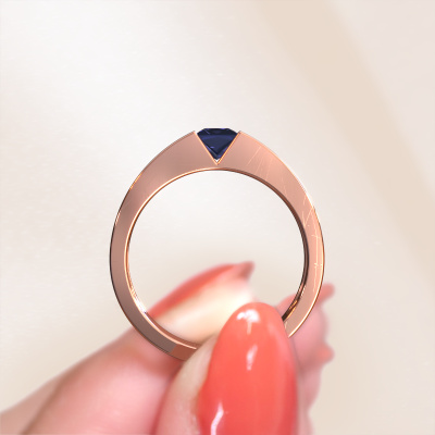 This 14 Carat rose gold ring is called Arlena 2 and is set with 4 mm sapphire. This modern rose gold Engagement ring is a true masterpiece! Our expert goldsmith uses special techniques during crafting of this tension set ring to make sure the sapphire of this rose gold ring is fixed properly. The effect is that light fall reflects beautifully on the gemstone, which gives the ring its maximum shine and glamorous appearance. The result is a unique ring, with a trendy appearance, passionately handcrafted to perfection by our artisan goldsmith. A one-of-a-kind ring, designed for the love of your life! This jewel is unique in every way! Simply customize to your likingBy using our modern techniques, we can design and customize the finest quality jewels with the utmost care for you. Our Engagement rings are always priced 30 percent lower than other jewellers. We make Engagement rings to order so we don't have to maintain a large stock. If you have a certain budget, we are more than happy to advice you accordingly.Have you found a specific Engagement ring somewhere which you would like to give to your loved one? Please feel free to express your wishes to our jewel designers because we would be honoured to turn your design into a modern Engagement ring. You can follow the development of your ring design because we use 3D drawings. This gives you a realistic preview of how your design will look. You can also preorder a dummy. A dummy is a plastic ring, which can be shaped according your ring design. You can try it on and check if its width and size are suitable for you. We will gladly send you a non-binding offer, based on a fair price/ quality ratio. It will amaze you, considering the quality of the ring and gemstones.To make it easier for you, we offer a 30 day return policy. Check our terms and conditions.