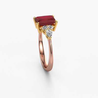 This 14 Carat rose gold ring is called Melani RAD and is set with 8x6 mm ruby. Does your girlfriend fancy exclusive jewellery? Or would you like to show her that she deserves the finest jewellery? This rose gold ring is pure craftsmanship, love and passion combined with the latest techniques coming together in perfect harmony. It requires a keen eye, patience and a skilful hand to mould this ring into perfection. Just the job for our expert goldsmith! The ruby set gemstones gives this rose gold ring an extra glamorous appearance. Customize the style of the stylish engagement ring to her liking with a wide variety of precious metals and gemstones which you select. That is how you create a unique ring for the most exclusive woman in your life! This jewel is unique in every way! Simply customize to your likingAfter receiving your order, our goldsmiths will start the creative process of making your Melani RAD engagement ring. We don't keep stock. This is advantageous because these costs will not be passed on to you. Therefore, we can offer jewellery at exceptionally low prices.Have you found a specific engagement ring somewhere which you would like to give to your loved one? Please feel free to express your wishes to our jewel designers because we would be honoured to turn your design into a fashionable engagement ring. You can follow the development of your ring design because we use 3D drawings. This gives you a realistic preview of how your design will look. You can also preorder a dummy. A dummy is a plastic ring, which can be shaped according your ring design. You can try it on and check if its width and size are suitable for you. We will gladly send you a non-binding offer, based on a fair price/ quality ratio. It will amaze you, considering the quality of the ring and gemstones.To make it easier for you, we offer a 30 day return policy. Check our terms and conditions.
