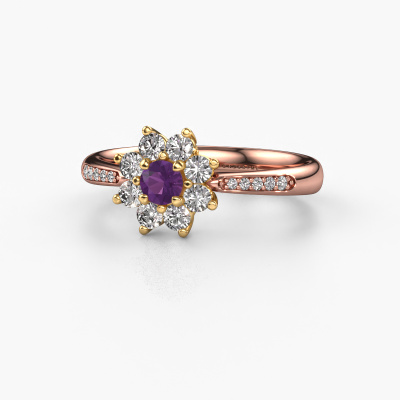 The ring shown above is called the Camille 2. We call this type of ring a cluster ring, the centre gemstone is surrounded by smaller sized stones. This 14 Carat rose gold version is set with a 3.4 mm round amethyst centre stone, embraced by smaller diamonds. If you look at this rose gold cluster engagement ring, you might get the impression that its smaller sized stones collide with the bigger amethyst, so it is shaped like a flower. Therefore this engagement ring is also known as the flower ring. Our artisan goldsmiths get the job done. Each individual stone is carefully set by hand. During manufacturing, light fall is constantly monitored to make sure the special cluster effect is still visible. In the end you get the perfect engagement ring with a radiant amethyst gemstone centrepiece. You can imagine the effect of a ring of such significance when you give tot the love of your life on her special day to shine. Because we design and deliver our own rings, we can offer you a engagement ring at a price you won't find anywhere else. A ring is made to order, which helps prevent excess supplies, so we can make you a great price offer. We understand it feels risky, buying your engagement ring online, but we will gladly assist in the designing process, taking your budget into consideration.Our team adds new designs to our online collection daily. Our designers and goldsmiths work together in creating the best design. We strive to offer a diverse collection of jewels. Perhaps you have a specific jewel design in mind. One you came across somewhere. Please contact us for a free consultation. We will make you an offer, based on a fair price/ quality ratio, that will baffle you.To make it easier for you, we offer a 30 day return policy. Check our terms and conditions.