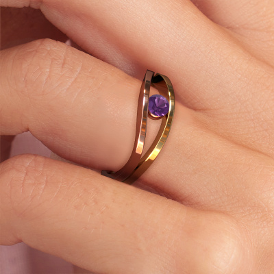 This 14 Carat rose gold ring is called Sigrid 1 and is set with 3.7 mm amethyst. This design rose gold engagement ring is a true masterpiece! Our expert goldsmith uses special techniques during crafting of this tension set ring to make sure the amethyst of this rose gold ring is fixed properly. The effect is that light fall reflects beautifully on the gemstone, which gives the ring its maximum shine and glamorous appearance. The result is a unique ring, with a trendy appearance, passionately handcrafted to perfection by our artisan goldsmith. A one-of-a-kind ring, designed for the love of your life! This jewel is made to shine bright around your finger. Each jewel is hand made with love by our goldsmiths.By using our modern techniques, we can design and customize the finest quality jewels with the utmost care for you. Our engagement rings are always priced 30 percent lower than other jewellers. We make engagement rings to order so we don't have to maintain a large stock. If you have a certain budget, we are more than happy to advice you accordingly.Different styles of new rings are made daily by our team. Perhaps you have found a solitaire engagement ring somewhere. One you would like to give to your loved one. Please feel free to share your thoughts and design with our jewel designers. We would love to turn your design into a design engagement ring. You can follow the development of your ring design because we use very detailed 3D drawings. On top of that, you can order a dummy of the design. A dummy is a plastic ring, which can be shaped according your ring design. You can try it on and check if the engagement ring is up to standard. We will gladly send you a non-binding offer, based on a fair price/ quality ratio. The offer will baffle you, considering the quality of the ring and gemstones.To make it easier for you, we offer a 30 day return policy. Check our terms and conditions.