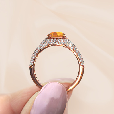 This 14 Carat rose gold ring is called Lovella and is set with 7 mm citrin. Does your girlfriend fancy exclusive jewellery? Or would you like to show her that she deserves the finest jewellery? This rose gold ring is pure craftsmanship, love and passion combined with the latest techniques coming together in perfect harmony. It requires a keen eye, patience and a skilful hand to mould this ring into perfection. Just the job for our expert goldsmith! The citrin set gemstones gives this rose gold ring an extra glamorous appearance. Customize the style of the micro pave engagement ring to her liking with a wide variety of precious metals and gemstones which you select. That is how you create a unique ring for the most exclusive woman in your life! This jewel is made just for you, with attention to detail and design.By using a combination of the latest modern techniques, combined with ancient crafting, we can make all our engagement rings in our own studio. Each jewel is made to order. This is advantageous because we can offer you a price you won't find anywhere else.Our team adds new designs to our online collection daily. Our designers and goldsmiths work together in creating the best design. We strive to offer a diverse collection of jewels. Perhaps you have a specific jewel design in mind. One you came across somewhere. Please contact us for a free consultation. We will make you an offer, based on a fair price/ quality ratio, that will baffle you.To make it easier for you, we offer a 30 day return policy. Check our terms and conditions.