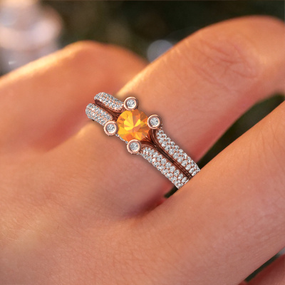 This 14 Carat rose gold ring is called Stefanie 2 and is set with 5 mm citrin. Does your girlfriend fancy exclusive jewellery? Or would you like to show her that she deserves the finest jewellery? This rose gold ring is pure craftsmanship, love and passion combined with the latest techniques coming together in perfect harmony. It requires a keen eye, patience and a skilful hand to mould this ring into perfection. Just the job for our expert goldsmith! The citrin set gemstones gives this rose gold ring an extra glamorous appearance. Customize the style of the split band engagement ring to her liking with a wide variety of precious metals and gemstones which you select. That is how you create a unique ring for the most exclusive woman in your life! This jewel is made just for you by our master goldsmiths in our own studio.After receiving your order, our goldsmiths will passionately start the creative process of making your engagement ring in our own studio. Because we don't have a big stockpile, these costs will not be passed on to you. Our pricing is proof of that! We offer top quality jewels at lowest price, guaranteed.Different styles of new rings are made daily by our team. Perhaps you have found a pavé solitaire engagement ring somewhere. One you would like to give to your loved one. Please feel free to share your thoughts and design with our jewel designers. We would love to turn your design into a unique engagement ring. You can follow the development of your ring design because we use very detailed 3D drawings. On top of that, you can order a dummy of the design. A dummy is a plastic ring, which can be shaped according your ring design. You can try it on and check if the engagement ring is up to standard. We will gladly send you a non-binding offer, based on a fair price/ quality ratio. The offer will baffle you, considering the quality of the ring and gemstones.To make it easier for you, we offer a 30 day return policy. Check our terms and conditions.