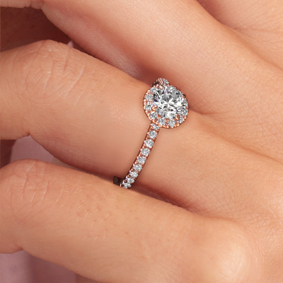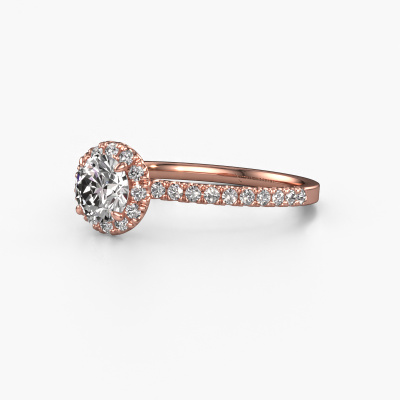 The ring shown above is called the Miranda rnd. We call this type of ring a halo ring because it has one centre gemstone and a band that is also pave set with gemstones. The 14 Carat rose gold engagement ring is set with a round 0.60 crt diamond centre stone and the band is pave set with lab-grown diamonds. What makes this exclusive rose gold halo ring special are the smaller sized stones embracing the centre stone. This gorgeous engagement ring is called a halo ring because the smaller gemstones give the centre stone a halo of surrounding light. In order for the smaller stones to enhance the centre stone, they have to be placed so there is no interference of light. And that's when our expert goldsmiths come in. Each individual stone is carefully set in the ring by hand. During manufacturing, light fall is constantly monitored to make sure the special halo is still visible. In the end you get a unique engagement ring, with a diamond of your choosing at its centre. You can imagine the effect of a ring of such significance when you give it to her on her special day to shine. By using our modern techniques, we can design and customize the finest quality jewels with the utmost care for you. Our engagement rings are always priced 30 percent lower than other jewellers. We make engagement rings to order so we don't have to maintain a large stock. If you have a certain budget, we are more than happy to advice you accordingly.Have you found a specific engagement ring somewhere which you would like to give to your loved one? Please feel free to express your wishes to our jewel designers because we would be honoured to turn your design into a exclusive engagement ring. You can follow the development of your ring design because we use 3D drawings. This gives you a realistic preview of how your design will look. You can also preorder a dummy. A dummy is a plastic ring, which can be shaped according your ring design. You can try it on and check if its width and size are suitable for you. We will gladly send you a non-binding offer, based on a fair price/ quality ratio. It will amaze you, considering the quality of the ring and gemstones.To make it easier for you, we offer a 30 day return policy. Check our terms and conditions.