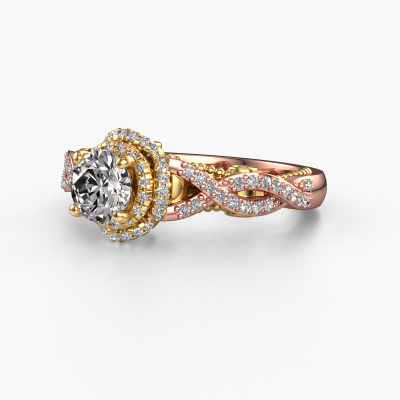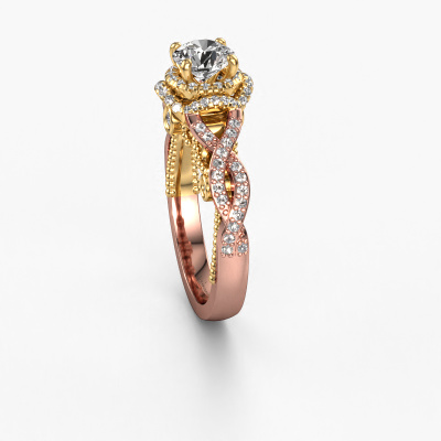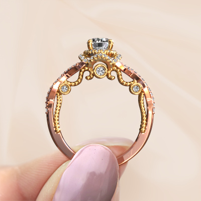 The ring shown above is called the Leora. We call this type of ring a halo ring because it has one centre gemstone and a band that is also pave set with gemstones. The 14 Carat rose gold engagement ring is set with a round 0.60 crt diamond centre stone and the band is pave set with lab-grown diamonds. What makes this vintage rose gold halo ring special are the smaller sized stones embracing the centre stone. This gorgeous engagement ring is called a halo ring because the smaller gemstones give the centre stone a halo of surrounding light. In order for the smaller stones to enhance the centre stone, they have to be placed so there is no interference of light. And that's when our expert goldsmiths come in. Each individual stone is carefully set in the ring by hand. During manufacturing, light fall is constantly monitored to make sure the special halo is still visible. In the end you get a unique engagement ring, with a diamond of your choosing at its centre. You can imagine the effect of a ring of such significance when you give it to her on her special day to shine. By using our modern techniques, we can design and customize the finest quality jewels with the utmost care for you. Our engagement rings are always priced 30 percent lower than other jewellers. We make engagement rings to order so we don't have to maintain a large stock. If you have a certain budget, we are more than happy to advice you accordingly.Our designers and goldsmiths work together each day, creating new jewels. Perhaps you have found a nice vintage engagement ring somewhere, which can be used to customize your unique ring. Please feel free to contact us. We will make you an offer, based on a fair price/ quality ratio, which will amaze you.To make it easier for you, we offer a 30 day return policy. Check our terms and conditions.