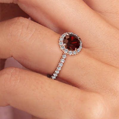 The ring shown above is called the Miranda rnd. We call this type of ring a halo ring because it has one centre gemstone and a band that is also pave set with gemstones. The 14 Carat rose gold engagement ring is set with a round 6.5 mm garnet centre stone and the band is pave set with lab-grown diamonds. What makes this exclusive rose gold halo ring special are the smaller sized stones embracing the centre stone. This gorgeous engagement ring is called a halo ring because the smaller gemstones give the centre stone a halo of surrounding light. In order for the smaller stones to enhance the centre stone, they have to be placed so there is no interference of light. And that's when our expert goldsmiths come in. Each individual stone is carefully set in the ring by hand. During manufacturing, light fall is constantly monitored to make sure the special halo is still visible. In the end you get a unique engagement ring, with a garnet of your choosing at its centre. You can imagine the effect of a ring of such significance when you give it to her on her special day to shine. By using our modern techniques, we can design and customize the finest quality jewels with the utmost care for you. Our engagement rings are always priced 30 percent lower than other jewellers. We make engagement rings to order so we don't have to maintain a large stock. If you have a certain budget, we are more than happy to advice you accordingly.Have you found a specific engagement ring somewhere which you would like to give to your loved one? Please feel free to express your wishes to our jewel designers because we would be honoured to turn your design into a exclusive engagement ring. You can follow the development of your ring design because we use 3D drawings. This gives you a realistic preview of how your design will look. You can also preorder a dummy. A dummy is a plastic ring, which can be shaped according your ring design. You can try it on and check if its width and size are suitable for you. We will gladly send you a non-binding offer, based on a fair price/ quality ratio. It will amaze you, considering the quality of the ring and gemstones.To make it easier for you, we offer a 30 day return policy. Check our terms and conditions.