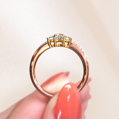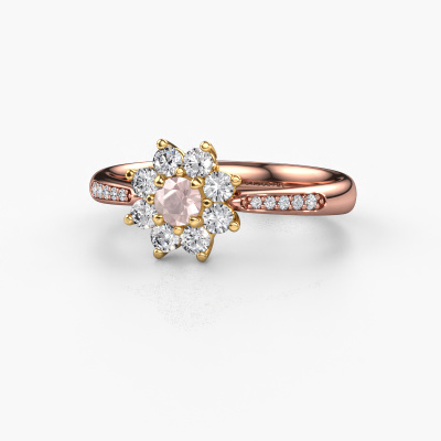 The ring shown above is called the Camille 2. We call this type of ring a cluster ring, the centre gemstone is surrounded by smaller sized stones. This 14 Carat rose gold version is set with a 3.4 mm round morganite champagne centre stone, embraced by smaller diamonds. If you look at this rose gold cluster engagement ring, you might get the impression that its smaller sized stones collide with the bigger morganite champagne, so it is shaped like a flower. Therefore this engagement ring is also known as the flower ring. Our artisan goldsmiths get the job done. Each individual stone is carefully set by hand. During manufacturing, light fall is constantly monitored to make sure the special cluster effect is still visible. In the end you get the perfect engagement ring with a radiant morganite champagne gemstone centrepiece. You can imagine the effect of a ring of such significance when you give tot the love of your life on her special day to shine.