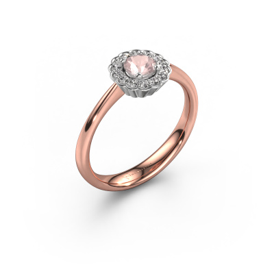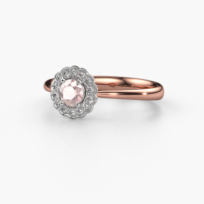 The ring shown above is called the Debi. We call this type of ring a halo ring because it has one centre gemstone and a band that is also pave set with gemstones. The 14 Carat rose gold engagement ring is set with a round 4.2 mm morganite champagne centre stone and the band is pave set with diamonds. What makes this classic rose gold halo ring special are the smaller sized stones embracing the centre stone. This gorgeous engagement ring is called a halo ring because the smaller gemstones give the centre stone a halo of surrounding light. In order for the smaller stones to enhance the centre stone, they have to be placed so there is no interference of light. And that's when our expert goldsmiths come in. Each individual stone is carefully set in the ring by hand. During manufacturing, light fall is constantly monitored to make sure the special halo is still visible. In the end you get a unique engagement ring, with a morganite champagne of your choosing at its centre. You can imagine the effect of a ring of such significance when you give it to her on her special day to shine. Because we design and deliver our own rings, we can offer you a engagement ring at a price you won't find anywhere else. A ring is made to order, which helps prevent excess supplies, so we can make you a great price offer. We understand it feels risky, buying your engagement ring online, but we will gladly assist in the designing process, taking your budget into consideration.Our team adds new designs to our online collection daily. Our designers and goldsmiths work together in creating the best design. We strive to offer a diverse collection of jewels. Perhaps you have a specific jewel design in mind. One you came across somewhere. Please contact us for a free consultation. We will make you an offer, based on a fair price/ quality ratio, that will baffle you.To make it easier for you, we offer a 30 day return policy. Check our terms and conditions.