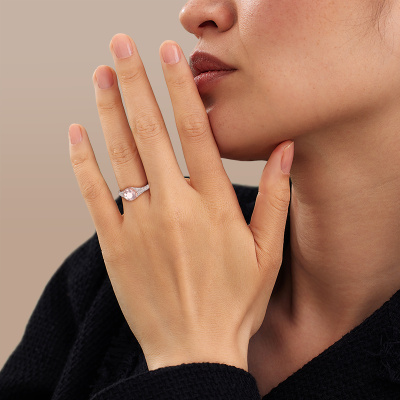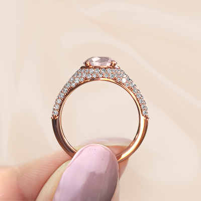 This 14 Carat rose gold ring is called Lovella and is set with 7 mm morganite champagne. Does your girlfriend fancy exclusive jewellery? Or would you like to show her that she deserves the finest jewellery? This rose gold ring is pure craftsmanship, love and passion combined with the latest techniques coming together in perfect harmony. It requires a keen eye, patience and a skilful hand to mould this ring into perfection. Just the job for our expert goldsmith! The morganite champagne set gemstones gives this rose gold ring an extra glamorous appearance. Customize the style of the micro pave engagement ring to her liking with a wide variety of precious metals and gemstones which you select. That is how you create a unique ring for the most exclusive woman in your life! This jewel is made just for you, with attention to detail and design.By using a combination of the latest modern techniques, combined with ancient crafting, we can make all our engagement rings in our own studio. Each jewel is made to order. This is advantageous because we can offer you a price you won't find anywhere else.Our team adds new designs to our online collection daily. Our designers and goldsmiths work together in creating the best design. We strive to offer a diverse collection of jewels. Perhaps you have a specific jewel design in mind. One you came across somewhere. Please contact us for a free consultation. We will make you an offer, based on a fair price/ quality ratio, that will baffle you.To make it easier for you, we offer a 30 day return policy. Check our terms and conditions.