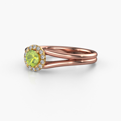 The ring shown above is called the Verla rnd 1. We call this type of ring a halo ring because it has one centre gemstone and a band that is also pave set with gemstones. The 14 Carat rose gold engagement ring is set with a round 4.7 mm peridot centre stone and the band is pave set with diamonds. What makes this classic rose gold halo ring special are the smaller sized stones embracing the centre stone. This gorgeous engagement ring is called a halo ring because the smaller gemstones give the centre stone a halo of surrounding light. In order for the smaller stones to enhance the centre stone, they have to be placed so there is no interference of light. And that's when our expert goldsmiths come in. Each individual stone is carefully set in the ring by hand. During manufacturing, light fall is constantly monitored to make sure the special halo is still visible. In the end you get a unique engagement ring, with a peridot of your choosing at its centre. You can imagine the effect of a ring of such significance when you give it to her on her special day to shine. By using a combination of the latest modern techniques, combined with ancient crafting, we can make all our engagement rings in our own studio. Each jewel is made to order. This is advantageous because we can offer you a price you won't find anywhere else.Our team adds new designs to our online collection daily. Our designers and goldsmiths work together in creating the best design. We strive to offer a diverse collection of jewels. Perhaps you have a specific jewel design in mind. One you came across somewhere. Please contact us for a free consultation. We will make you an offer, based on a fair price/ quality ratio, that will baffle you.To make it easier for you, we offer a 30 day return policy. Check our terms and conditions.