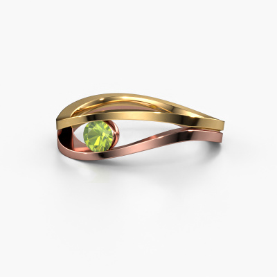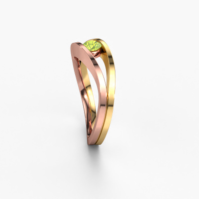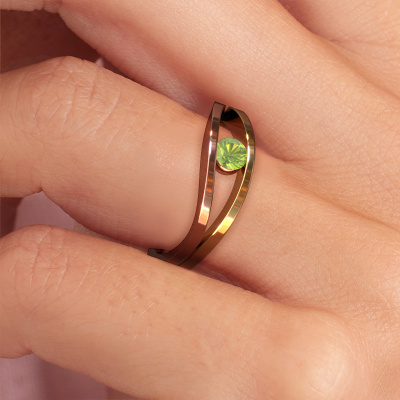 This 14 Carat rose gold ring is called Sigrid 1 and is set with 3.7 mm peridot. This design rose gold engagement ring is a true masterpiece! Our expert goldsmith uses special techniques during crafting of this tension set ring to make sure the peridot of this rose gold ring is fixed properly. The effect is that light fall reflects beautifully on the gemstone, which gives the ring its maximum shine and glamorous appearance. The result is a unique ring, with a trendy appearance, passionately handcrafted to perfection by our artisan goldsmith. A one-of-a-kind ring, designed for the love of your life! This jewel is made to shine bright around your finger. Each jewel is hand made with love by our goldsmiths.By using our modern techniques, we can design and customize the finest quality jewels with the utmost care for you. Our engagement rings are always priced 30 percent lower than other jewellers. We make engagement rings to order so we don't have to maintain a large stock. If you have a certain budget, we are more than happy to advice you accordingly.Different styles of new rings are made daily by our team. Perhaps you have found a solitaire engagement ring somewhere. One you would like to give to your loved one. Please feel free to share your thoughts and design with our jewel designers. We would love to turn your design into a design engagement ring. You can follow the development of your ring design because we use very detailed 3D drawings. On top of that, you can order a dummy of the design. A dummy is a plastic ring, which can be shaped according your ring design. You can try it on and check if the engagement ring is up to standard. We will gladly send you a non-binding offer, based on a fair price/ quality ratio. The offer will baffle you, considering the quality of the ring and gemstones.To make it easier for you, we offer a 30 day return policy. Check our terms and conditions.