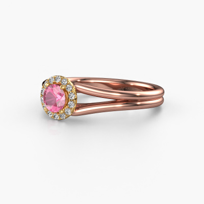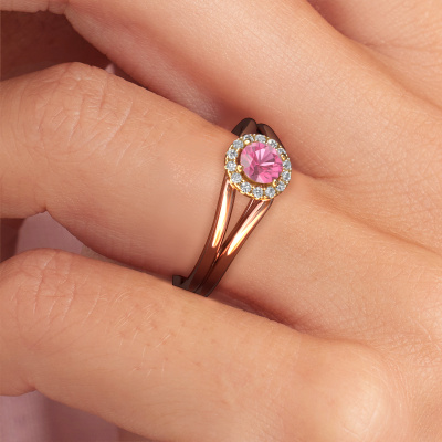 The ring shown above is called the Verla rnd 1. We call this type of ring a halo ring because it has one centre gemstone and a band that is also pave set with gemstones. The 14 Carat rose gold engagement ring is set with a round 4.7 mm pink sapphire centre stone and the band is pave set with diamonds. What makes this classic rose gold halo ring special are the smaller sized stones embracing the centre stone. This gorgeous engagement ring is called a halo ring because the smaller gemstones give the centre stone a halo of surrounding light. In order for the smaller stones to enhance the centre stone, they have to be placed so there is no interference of light. And that's when our expert goldsmiths come in. Each individual stone is carefully set in the ring by hand. During manufacturing, light fall is constantly monitored to make sure the special halo is still visible. In the end you get a unique engagement ring, with a pink sapphire of your choosing at its centre. You can imagine the effect of a ring of such significance when you give it to her on her special day to shine. By using a combination of the latest modern techniques, combined with ancient crafting, we can make all our engagement rings in our own studio. Each jewel is made to order. This is advantageous because we can offer you a price you won't find anywhere else.Our team adds new designs to our online collection daily. Our designers and goldsmiths work together in creating the best design. We strive to offer a diverse collection of jewels. Perhaps you have a specific jewel design in mind. One you came across somewhere. Please contact us for a free consultation. We will make you an offer, based on a fair price/ quality ratio, that will baffle you.To make it easier for you, we offer a 30 day return policy. Check our terms and conditions.