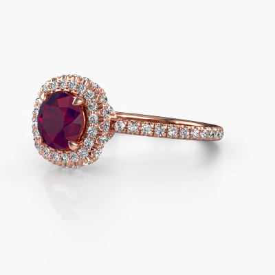 The ring shown above is called the Talitha RND. We call this type of ring a halo ring because it has one centre gemstone and a band that is also pave set with gemstones. The 14 Carat rose gold engagement ring is set with a round 6.5 mm rhodolite centre stone and the band is pave set with lab-grown diamonds. What makes this exclusive rose gold halo ring special are the smaller sized stones embracing the centre stone. This gorgeous engagement ring is called a halo ring because the smaller gemstones give the centre stone a halo of surrounding light. In order for the smaller stones to enhance the centre stone, they have to be placed so there is no interference of light. And that's when our expert goldsmiths come in. Each individual stone is carefully set in the ring by hand. During manufacturing, light fall is constantly monitored to make sure the special halo is still visible. In the end you get a unique engagement ring, with a rhodolite of your choosing at its centre. You can imagine the effect of a ring of such significance when you give it to her on her special day to shine. Are you on a budget? Please feel free to contact us, so we can go discuss your options. We offer our engagement rings at guaranteed best price, because we make them to order. You won't find such a price anywhere else!Our team adds new designs to our online collection daily. Our designers and goldsmiths work together in creating the best design. We strive to offer a diverse collection of jewels. Perhaps you have a specific jewel design in mind. One you came across somewhere. Please contact us for a free consultation. We will make you an offer, based on a fair price/ quality ratio, that will baffle you.To make it easier for you, we offer a 30 day return policy. Check our terms and conditions.