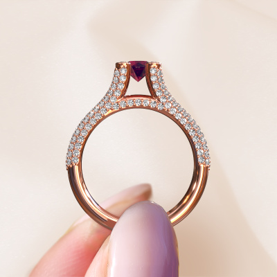This 14 Carat rose gold ring is called Stefanie 2 and is set with 5 mm rhodolite. Does your girlfriend fancy exclusive jewellery? Or would you like to show her that she deserves the finest jewellery? This rose gold ring is pure craftsmanship, love and passion combined with the latest techniques coming together in perfect harmony. It requires a keen eye, patience and a skilful hand to mould this ring into perfection. Just the job for our expert goldsmith! The rhodolite set gemstones gives this rose gold ring an extra glamorous appearance. Customize the style of the split band engagement ring to her liking with a wide variety of precious metals and gemstones which you select. That is how you create a unique ring for the most exclusive woman in your life! This jewel is made just for you by our master goldsmiths in our own studio.After receiving your order, our goldsmiths will passionately start the creative process of making your engagement ring in our own studio. Because we don't have a big stockpile, these costs will not be passed on to you. Our pricing is proof of that! We offer top quality jewels at lowest price, guaranteed.Different styles of new rings are made daily by our team. Perhaps you have found a pavé solitaire engagement ring somewhere. One you would like to give to your loved one. Please feel free to share your thoughts and design with our jewel designers. We would love to turn your design into a unique engagement ring. You can follow the development of your ring design because we use very detailed 3D drawings. On top of that, you can order a dummy of the design. A dummy is a plastic ring, which can be shaped according your ring design. You can try it on and check if the engagement ring is up to standard. We will gladly send you a non-binding offer, based on a fair price/ quality ratio. The offer will baffle you, considering the quality of the ring and gemstones.To make it easier for you, we offer a 30 day return policy. Check our terms and conditions.