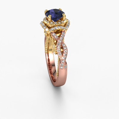 The ring shown above is called the Leora. We call this type of ring a halo ring because it has one centre gemstone and a band that is also pave set with gemstones. The 14 Carat rose gold engagement ring is set with a round 6.5 mm sapphire centre stone and the band is pave set with lab-grown diamonds. What makes this vintage rose gold halo ring special are the smaller sized stones embracing the centre stone. This gorgeous engagement ring is called a halo ring because the smaller gemstones give the centre stone a halo of surrounding light. In order for the smaller stones to enhance the centre stone, they have to be placed so there is no interference of light. And that's when our expert goldsmiths come in. Each individual stone is carefully set in the ring by hand. During manufacturing, light fall is constantly monitored to make sure the special halo is still visible. In the end you get a unique engagement ring, with a sapphire of your choosing at its centre. You can imagine the effect of a ring of such significance when you give it to her on her special day to shine. By using our modern techniques, we can design and customize the finest quality jewels with the utmost care for you. Our engagement rings are always priced 30 percent lower than other jewellers. We make engagement rings to order so we don't have to maintain a large stock. If you have a certain budget, we are more than happy to advice you accordingly.Our designers and goldsmiths work together each day, creating new jewels. Perhaps you have found a nice vintage engagement ring somewhere, which can be used to customize your unique ring. Please feel free to contact us. We will make you an offer, based on a fair price/ quality ratio, which will amaze you.To make it easier for you, we offer a 30 day return policy. Check our terms and conditions.