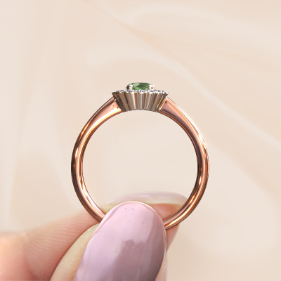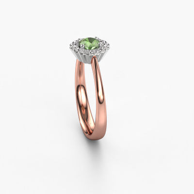 The ring shown above is called the Debi. We call this type of ring a halo ring because it has one centre gemstone and a band that is also pave set with gemstones. The 14 Carat rose gold engagement ring is set with a round 4.2 mm tourmaline green centre stone and the band is pave set with diamonds. What makes this classic rose gold halo ring special are the smaller sized stones embracing the centre stone. This gorgeous engagement ring is called a halo ring because the smaller gemstones give the centre stone a halo of surrounding light. In order for the smaller stones to enhance the centre stone, they have to be placed so there is no interference of light. And that's when our expert goldsmiths come in. Each individual stone is carefully set in the ring by hand. During manufacturing, light fall is constantly monitored to make sure the special halo is still visible. In the end you get a unique engagement ring, with a tourmaline green of your choosing at its centre. You can imagine the effect of a ring of such significance when you give it to her on her special day to shine. Because we design and deliver our own rings, we can offer you a engagement ring at a price you won't find anywhere else. A ring is made to order, which helps prevent excess supplies, so we can make you a great price offer. We understand it feels risky, buying your engagement ring online, but we will gladly assist in the designing process, taking your budget into consideration.Our team adds new designs to our online collection daily. Our designers and goldsmiths work together in creating the best design. We strive to offer a diverse collection of jewels. Perhaps you have a specific jewel design in mind. One you came across somewhere. Please contact us for a free consultation. We will make you an offer, based on a fair price/ quality ratio, that will baffle you.To make it easier for you, we offer a 30 day return policy. Check our terms and conditions.