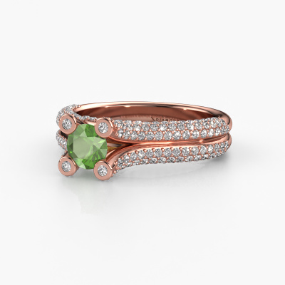 This 14 Carat rose gold ring is called Stefanie 2 and is set with 5 mm tourmaline green. Does your girlfriend fancy exclusive jewellery? Or would you like to show her that she deserves the finest jewellery? This rose gold ring is pure craftsmanship, love and passion combined with the latest techniques coming together in perfect harmony. It requires a keen eye, patience and a skilful hand to mould this ring into perfection. Just the job for our expert goldsmith! The tourmaline green set gemstones gives this rose gold ring an extra glamorous appearance. Customize the style of the split band engagement ring to her liking with a wide variety of precious metals and gemstones which you select. That is how you create a unique ring for the most exclusive woman in your life! This jewel is made just for you by our master goldsmiths in our own studio.After receiving your order, our goldsmiths will passionately start the creative process of making your engagement ring in our own studio. Because we don't have a big stockpile, these costs will not be passed on to you. Our pricing is proof of that! We offer top quality jewels at lowest price, guaranteed.Different styles of new rings are made daily by our team. Perhaps you have found a pavé solitaire engagement ring somewhere. One you would like to give to your loved one. Please feel free to share your thoughts and design with our jewel designers. We would love to turn your design into a unique engagement ring. You can follow the development of your ring design because we use very detailed 3D drawings. On top of that, you can order a dummy of the design. A dummy is a plastic ring, which can be shaped according your ring design. You can try it on and check if the engagement ring is up to standard. We will gladly send you a non-binding offer, based on a fair price/ quality ratio. The offer will baffle you, considering the quality of the ring and gemstones.To make it easier for you, we offer a 30 day return policy. Check our terms and conditions.
