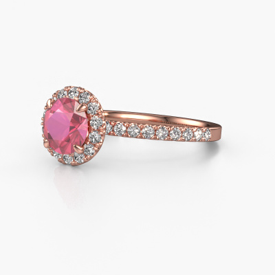 The ring shown above is called the Miranda rnd. We call this type of ring a halo ring because it has one centre gemstone and a band that is also pave set with gemstones. The 14 Carat rose gold engagement ring is set with a round 6.5 mm tourmaline pink centre stone and the band is pave set with lab-grown diamonds. What makes this exclusive rose gold halo ring special are the smaller sized stones embracing the centre stone. This gorgeous engagement ring is called a halo ring because the smaller gemstones give the centre stone a halo of surrounding light. In order for the smaller stones to enhance the centre stone, they have to be placed so there is no interference of light. And that's when our expert goldsmiths come in. Each individual stone is carefully set in the ring by hand. During manufacturing, light fall is constantly monitored to make sure the special halo is still visible. In the end you get a unique engagement ring, with a tourmaline pink of your choosing at its centre. You can imagine the effect of a ring of such significance when you give it to her on her special day to shine. By using our modern techniques, we can design and customize the finest quality jewels with the utmost care for you. Our engagement rings are always priced 30 percent lower than other jewellers. We make engagement rings to order so we don't have to maintain a large stock. If you have a certain budget, we are more than happy to advice you accordingly.Have you found a specific engagement ring somewhere which you would like to give to your loved one? Please feel free to express your wishes to our jewel designers because we would be honoured to turn your design into a exclusive engagement ring. You can follow the development of your ring design because we use 3D drawings. This gives you a realistic preview of how your design will look. You can also preorder a dummy. A dummy is a plastic ring, which can be shaped according your ring design. You can try it on and check if its width and size are suitable for you. We will gladly send you a non-binding offer, based on a fair price/ quality ratio. It will amaze you, considering the quality of the ring and gemstones.To make it easier for you, we offer a 30 day return policy. Check our terms and conditions.