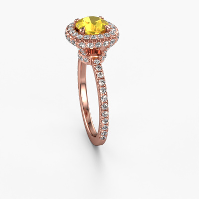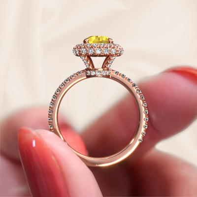 The ring shown above is called the Talitha RND. We call this type of ring a halo ring because it has one centre gemstone and a band that is also pave set with gemstones. The 14 Carat rose gold engagement ring is set with a round 6.5 mm yellow sapphire centre stone and the band is pave set with lab-grown diamonds. What makes this exclusive rose gold halo ring special are the smaller sized stones embracing the centre stone. This gorgeous engagement ring is called a halo ring because the smaller gemstones give the centre stone a halo of surrounding light. In order for the smaller stones to enhance the centre stone, they have to be placed so there is no interference of light. And that's when our expert goldsmiths come in. Each individual stone is carefully set in the ring by hand. During manufacturing, light fall is constantly monitored to make sure the special halo is still visible. In the end you get a unique engagement ring, with a yellow sapphire of your choosing at its centre. You can imagine the effect of a ring of such significance when you give it to her on her special day to shine. Are you on a budget? Please feel free to contact us, so we can go discuss your options. We offer our engagement rings at guaranteed best price, because we make them to order. You won't find such a price anywhere else!Our team adds new designs to our online collection daily. Our designers and goldsmiths work together in creating the best design. We strive to offer a diverse collection of jewels. Perhaps you have a specific jewel design in mind. One you came across somewhere. Please contact us for a free consultation. We will make you an offer, based on a fair price/ quality ratio, that will baffle you.To make it easier for you, we offer a 30 day return policy. Check our terms and conditions.