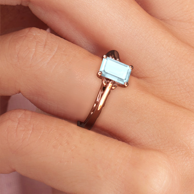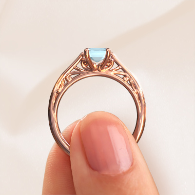 This 14 Carat rose gold ring is called Shannon eme and is set with aquamarine. An extraordinary rose gold vintage ring. One that will surely make the love of your life shine like a diamond! That is what we hope to achieve. This fantasy engagement ring is set with exquisite aquamarine. Whichever gemstone you choose from our selection, is up to you. The gemstone is selected with great care because we believe your engagement ring must be adorned with nothing but the most beautiful gemstone. Wouldn't you agree? Our expert goldsmith will design your ring in our own artisan studio, where the aquamarine will be set with great precision. The ring will then be polished till it is absolutely perfect. Nothing but the best for the love of your life! This jewel is unique in every way! Simply customize to your liking,Are you on a budget? Please feel free to contact us, so we can go discuss your options. We offer our engagement rings at guaranteed best price, because we make them to order. You won't find such a price anywhere else!Our designers and goldsmiths work together each day, creating new jewels. Perhaps you have found a nice fantasy engagement ring somewhere, which can be used to customize your unique ring. Please feel free to contact us. We will make you an offer, based on a fair price/ quality ratio, which will amaze you.To make it easier for you, we offer a 30 day return policy. Check our terms and conditions.