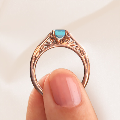 This 14 Carat rose gold ring is called Shannon eme and is set with blue topaz. An extraordinary rose gold vintage ring. One that will surely make the love of your life shine like a diamond! That is what we hope to achieve. This fantasy engagement ring is set with exquisite blue topaz. Whichever gemstone you choose from our selection, is up to you. The gemstone is selected with great care because we believe your engagement ring must be adorned with nothing but the most beautiful gemstone. Wouldn't you agree? Our expert goldsmith will design your ring in our own artisan studio, where the blue topaz will be set with great precision. The ring will then be polished till it is absolutely perfect. Nothing but the best for the love of your life! This jewel is unique in every way! Simply customize to your liking,Are you on a budget? Please feel free to contact us, so we can go discuss your options. We offer our engagement rings at guaranteed best price, because we make them to order. You won't find such a price anywhere else!Our designers and goldsmiths work together each day, creating new jewels. Perhaps you have found a nice fantasy engagement ring somewhere, which can be used to customize your unique ring. Please feel free to contact us. We will make you an offer, based on a fair price/ quality ratio, which will amaze you.To make it easier for you, we offer a 30 day return policy. Check our terms and conditions.