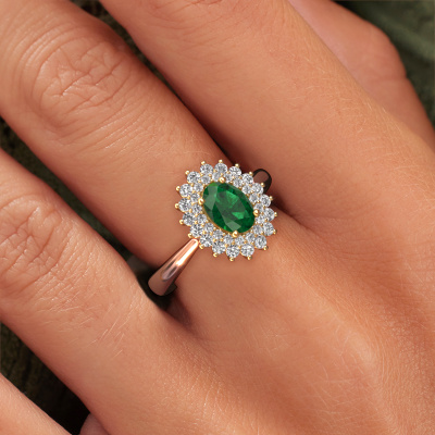 The ring shown above is called the Alina 1. We call this type of ring a cluster ring, the centre gemstone is surrounded by smaller sized stones. This 14 Carat rose gold version is set with a 7x5 mm oval emerald centre stone, embraced by smaller diamonds. The classic rose gold cluster engagement ring stands out because of its shape. Together, the smaller and bigger sized emerald gemstones form a flower and they appear to collide into one big sparkling gem. This classic engagement ring is also known as the flower ring. Our expert Goldsmiths make sure the smaller diamonds stones are set identically so there is no light interference in the emerald but unity instead. With perfect precision and a skilful hand each emerald is set in the ring. During manufacturing, it is constantly monitored to make sure light reflects flawlessly. This results in a unique engagement ring, with a radiant emerald at its centre. A lovely, meaningful gift to bestow upon the love of your life. Are you on a budget? Please feel free to contact us, so we can go discuss your options. We offer our engagement rings at guaranteed best price, because we make them to order. You won't find such a price anywhere else!Our designers and goldsmiths work together each day, creating new jewels. Perhaps you have found a nice classic engagement ring somewhere, which can be used to customize your unique ring. Please feel free to contact us. We will make you an offer, based on a fair price/ quality ratio, which will amaze you.To make it easier for you, we offer a 30 day return policy. Check our terms and conditions.