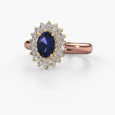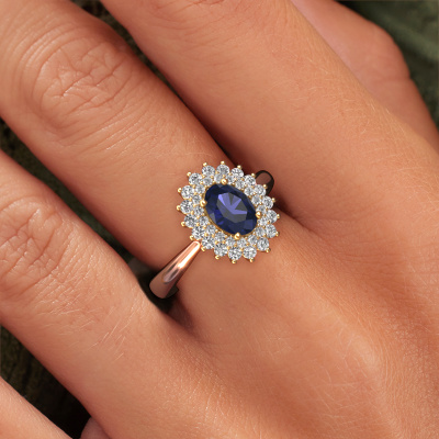 The ring shown above is called the Alina 1. We call this type of ring a cluster ring, the centre gemstone is surrounded by smaller sized stones. This 14 Carat rose gold version is set with a 7x5 mm oval sapphire centre stone, embraced by smaller diamonds. The classic rose gold cluster engagement ring stands out because of its shape. Together, the smaller and bigger sized sapphire gemstones form a flower and they appear to collide into one big sparkling gem. This classic engagement ring is also known as the flower ring. Our expert Goldsmiths make sure the smaller diamonds stones are set identically so there is no light interference in the sapphire but unity instead. With perfect precision and a skilful hand each sapphire is set in the ring. During manufacturing, it is constantly monitored to make sure light reflects flawlessly. This results in a unique engagement ring, with a radiant sapphire at its centre. A lovely, meaningful gift to bestow upon the love of your life. Are you on a budget? Please feel free to contact us, so we can go discuss your options. We offer our engagement rings at guaranteed best price, because we make them to order. You won't find such a price anywhere else!Our designers and goldsmiths work together each day, creating new jewels. Perhaps you have found a nice classic engagement ring somewhere, which can be used to customize your unique ring. Please feel free to contact us. We will make you an offer, based on a fair price/ quality ratio, which will amaze you.To make it easier for you, we offer a 30 day return policy. Check our terms and conditions.