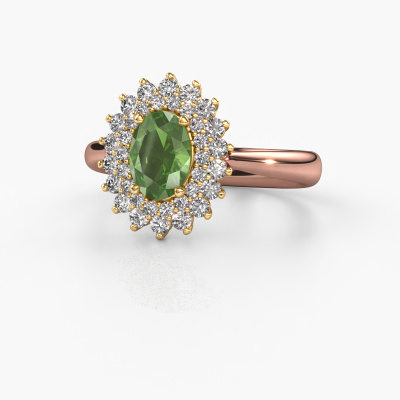 The ring shown above is called the Alina 1. We call this type of ring a cluster ring, the centre gemstone is surrounded by smaller sized stones. This 14 Carat rose gold version is set with a 7x5 mm oval tourmaline green centre stone, embraced by smaller diamonds. The classic rose gold cluster engagement ring stands out because of its shape. Together, the smaller and bigger sized tourmaline green gemstones form a flower and they appear to collide into one big sparkling gem. This classic engagement ring is also known as the flower ring. Our expert Goldsmiths make sure the smaller diamonds stones are set identically so there is no light interference in the tourmaline green but unity instead. With perfect precision and a skilful hand each tourmaline green is set in the ring. During manufacturing, it is constantly monitored to make sure light reflects flawlessly. This results in a unique engagement ring, with a radiant tourmaline green at its centre. A lovely, meaningful gift to bestow upon the love of your life. Are you on a budget? Please feel free to contact us, so we can go discuss your options. We offer our engagement rings at guaranteed best price, because we make them to order. You won't find such a price anywhere else!Our designers and goldsmiths work together each day, creating new jewels. Perhaps you have found a nice classic engagement ring somewhere, which can be used to customize your unique ring. Please feel free to contact us. We will make you an offer, based on a fair price/ quality ratio, which will amaze you.To make it easier for you, we offer a 30 day return policy. Check our terms and conditions.