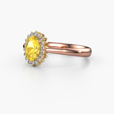 The ring shown above is called the Tilly ovl 1. We call this type of ring a cluster ring, the centre gemstone is surrounded by smaller sized stones. This 14 Carat rose gold version is set with a 7x5 mm oval yellow sapphire centre stone, embraced by smaller lab-grown diamonds. The classic rose gold cluster engagement ring stands out because of its shape. Together, the smaller and bigger sized yellow sapphire gemstones form a flower and they appear to collide into one big sparkling gem. This classic engagement ring is also known as the flower ring. Our expert Goldsmiths make sure the smaller lab-grown diamonds stones are set identically so there is no light interference in the yellow sapphire but unity instead. With perfect precision and a skilful hand each yellow sapphire is set in the ring. During manufacturing, it is constantly monitored to make sure light reflects flawlessly. This results in a unique engagement ring, with a radiant yellow sapphire at its centre. A lovely, meaningful gift to bestow upon the love of your life. By using a combination of the latest modern techniques, combined with ancient crafting, we can make all our engagement rings in our own studio. Each jewel is made to order. This is advantageous because we can offer you a price you won't find anywhere else.Do you have a specific ring in mind? One you came across somewhere. Please feel free to tell us your wishes and we will turn your design into a unique engagement ring. You can follow the development of your ring design because we use 3D drawings. This gives you a realistic preview of your design. We will gladly send you a non-binding offer, based on a fair price/ quality ratio. It will amaze you.To make it easier for you, we offer a 30 day return policy. Check our terms and conditions.