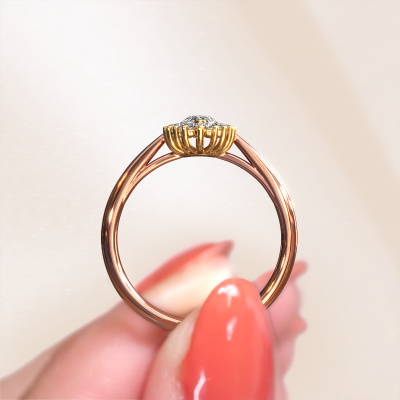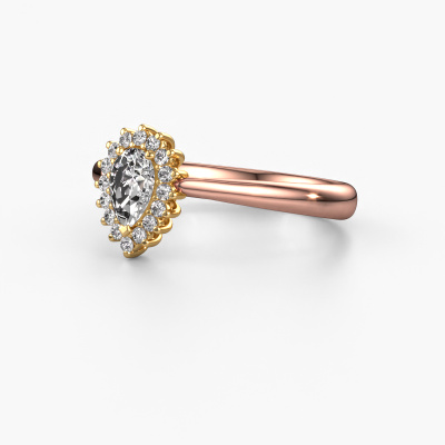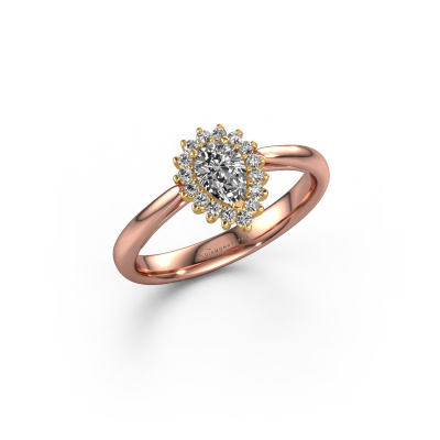 The ring shown above is called the Tilly per 1. We call this type of ring a cluster ring, the centre gemstone is surrounded by smaller sized stones. This 14 Carat rose gold version is set with a 0.45 crt pear diamond centre stone, embraced by smaller diamonds. The exclusive rose gold cluster engagement ring stands out because of its shape. Together, the smaller and bigger sized diamond gemstones form a flower and they appear to collide into one big sparkling gem. This exclusive engagement ring is also known as the flower ring. Our expert Goldsmiths make sure the smaller diamonds stones are set identically so there is no light interference in the diamond but unity instead. With perfect precision and a skilful hand each diamond is set in the ring. During manufacturing, it is constantly monitored to make sure light reflects flawlessly. This results in a unique engagement ring, with a radiant diamond at its centre. A lovely, meaningful gift to bestow upon the love of your life. After receiving your order, our goldsmiths will start the creative process of making your Tilly per 1 engagement ring. We don't keep stock. This is advantageous because these costs will not be passed on to you. Therefore, we can offer jewellery at exceptionally low prices.Our team adds new designs to our online collection daily. Our designers and goldsmiths work together in creating the best design. We strive to offer a diverse collection of jewels. Perhaps you have a specific jewel design in mind. One you came across somewhere. Please contact us for a free consultation. We will make you an offer, based on a fair price/ quality ratio, that will baffle you.To make it easier for you, we offer a 30 day return policy. Check our terms and conditions.