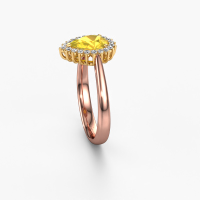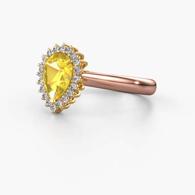 The ring shown above is called the Tilly per 1. We call this type of ring a cluster ring, the centre gemstone is surrounded by smaller sized stones. This 14 Carat rose gold version is set with a 8x6 mm pear yellow sapphire centre stone, embraced by smaller diamonds. The exclusive rose gold cluster engagement ring stands out because of its shape. Together, the smaller and bigger sized yellow sapphire gemstones form a flower and they appear to collide into one big sparkling gem. This exclusive engagement ring is also known as the flower ring. Our expert Goldsmiths make sure the smaller diamonds stones are set identically so there is no light interference in the yellow sapphire but unity instead. With perfect precision and a skilful hand each yellow sapphire is set in the ring. During manufacturing, it is constantly monitored to make sure light reflects flawlessly. This results in a unique engagement ring, with a radiant yellow sapphire at its centre. A lovely, meaningful gift to bestow upon the love of your life. After receiving your order, our goldsmiths will start the creative process of making your Tilly per 1 engagement ring. We don't keep stock. This is advantageous because these costs will not be passed on to you. Therefore, we can offer jewellery at exceptionally low prices.Our team adds new designs to our online collection daily. Our designers and goldsmiths work together in creating the best design. We strive to offer a diverse collection of jewels. Perhaps you have a specific jewel design in mind. One you came across somewhere. Please contact us for a free consultation. We will make you an offer, based on a fair price/ quality ratio, that will baffle you.To make it easier for you, we offer a 30 day return policy. Check our terms and conditions.