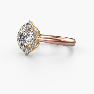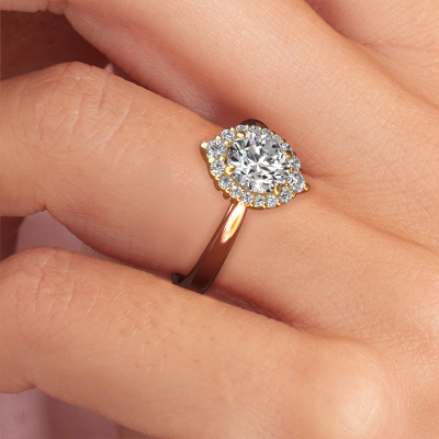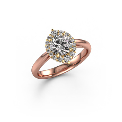 The ring shown above is called the Tora. We call this type of ring a cluster ring, the centre gemstone is surrounded by smaller sized stones. This 14 Carat rose gold version is set with a 1.00 crt round diamond centre stone, embraced by smaller lab-grown diamonds. The classic rose gold cluster engagement ring stands out because of its shape. Together, the smaller and bigger sized diamond gemstones form a flower and they appear to collide into one big sparkling gem. This classic engagement ring is also known as the flower ring. Our expert Goldsmiths make sure the smaller lab-grown diamonds stones are set identically so there is no light interference in the diamond but unity instead. With perfect precision and a skilful hand each diamond is set in the ring. During manufacturing, it is constantly monitored to make sure light reflects flawlessly. This results in a unique engagement ring, with a radiant diamond at its centre. A lovely, meaningful gift to bestow upon the love of your life. By using a combination of the latest modern techniques, combined with ancient crafting, we can make all our engagement rings in our own studio. Each jewel is made to order. This is advantageous because we can offer you a price you won't find anywhere else.Have you found a specific engagement ring somewhere which you would like to give to your loved one? Please feel free to express your wishes to our jewel designers because we would be honoured to turn your design into a classic engagement ring. You can follow the development of your ring design because we use 3D drawings. This gives you a realistic preview of how your design will look. You can also preorder a dummy. A dummy is a plastic ring, which can be shaped according your ring design. You can try it on and check if its width and size are suitable for you. We will gladly send you a non-binding offer, based on a fair price/ quality ratio. It will amaze you, considering the quality of the ring and gemstones.To make it easier for you, we offer a 30 day return policy. Check our terms and conditions.