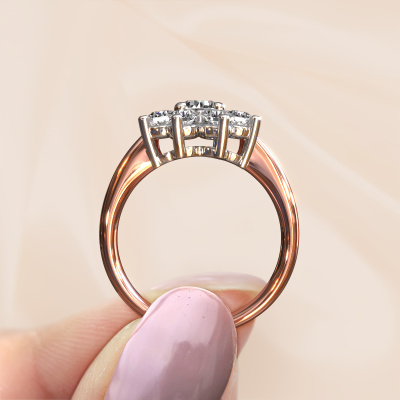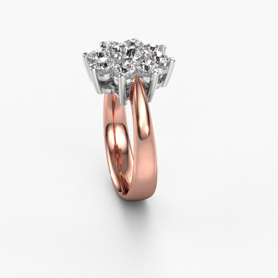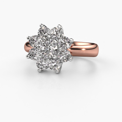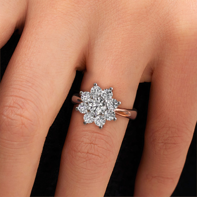The ring shown above is called the Camille 1. We call this type of ring a cluster ring, the centre gemstone is surrounded by smaller sized stones. This 14 Carat rose gold version is set with a 0.50 crt round diamond centre stone, embraced by smaller diamonds. The traditional rose gold cluster engagement ring stands out because of its shape. Together, the smaller and bigger sized diamond gemstones form a flower and they appear to collide into one big sparkling gem. This traditional engagement ring is also known as the flower ring. Our expert Goldsmiths make sure the smaller diamonds stones are set identically so there is no light interference in the diamond but unity instead. With perfect precision and a skilful hand each diamond is set in the ring. During manufacturing, it is constantly monitored to make sure light reflects flawlessly. This results in a unique engagement ring, with a radiant diamond at its centre. A lovely, meaningful gift to bestow upon the love of your life. By using our modern techniques, we can design and customize the finest quality jewels with the utmost care for you. Our engagement rings are always priced 30 percent lower than other jewellers. We make engagement rings to order so we don't have to maintain a large stock. If you have a certain budget, we are more than happy to advice you accordingly.Our team adds new designs to our online collection daily. Our designers and goldsmiths work together in creating the best design. We strive to offer a diverse collection of jewels. Perhaps you have a specific jewel design in mind. One you came across somewhere. Please contact us for a free consultation. We will make you an offer, based on a fair price/ quality ratio, that will baffle you.To make it easier for you, we offer a 30 day return policy. Check our terms and conditions.