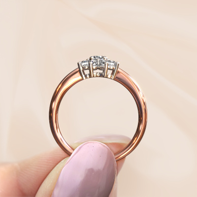 The ring shown above is called the Camille 1. We call this type of ring a cluster ring, the centre gemstone is surrounded by smaller sized stones. This 14 Carat rose gold version is set with a 0.15 crt round lab grown diamond centre stone, embraced by smaller diamonds. The traditional rose gold cluster engagement ring stands out because of its shape. Together, the smaller and bigger sized lab grown diamond gemstones form a flower and they appear to collide into one big sparkling gem. This traditional engagement ring is also known as the flower ring. Our expert Goldsmiths make sure the smaller diamonds stones are set identically so there is no light interference in the lab grown diamond but unity instead. With perfect precision and a skilful hand each lab grown diamond is set in the ring. During manufacturing, it is constantly monitored to make sure light reflects flawlessly. This results in a unique engagement ring, with a radiant lab grown diamond at its centre. A lovely, meaningful gift to bestow upon the love of your life. By using our modern techniques, we can design and customize the finest quality jewels with the utmost care for you. Our engagement rings are always priced 30 percent lower than other jewellers. We make engagement rings to order so we don't have to maintain a large stock. If you have a certain budget, we are more than happy to advice you accordingly.Our team adds new designs to our online collection daily. Our designers and goldsmiths work together in creating the best design. We strive to offer a diverse collection of jewels. Perhaps you have a specific jewel design in mind. One you came across somewhere. Please contact us for a free consultation. We will make you an offer, based on a fair price/ quality ratio, that will baffle you.To make it easier for you, we offer a 30 day return policy. Check our terms and conditions.