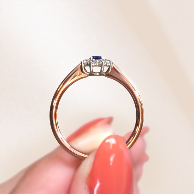 The ring shown above is called the Carolyn 1. We call this type of ring a cluster ring, the centre gemstone is surrounded by smaller sized stones. This 14 Carat rose gold version is set with a 3 mm round sapphire centre stone, embraced by smaller diamonds. The traditional rose gold cluster engagement ring stands out because of its shape. Together, the smaller and bigger sized sapphire gemstones form a flower and they appear to collide into one big sparkling gem. This traditional engagement ring is also known as the flower ring. Our expert Goldsmiths make sure the smaller diamonds stones are set identically so there is no light interference in the sapphire but unity instead. With perfect precision and a skilful hand each sapphire is set in the ring. During manufacturing, it is constantly monitored to make sure light reflects flawlessly. This results in a unique engagement ring, with a radiant sapphire at its centre. A lovely, meaningful gift to bestow upon the love of your life. By using our modern techniques, we can design and customize the finest quality jewels with the utmost care for you. Our engagement rings are always priced 30 percent lower than other jewellers. We make engagement rings to order so we don't have to maintain a large stock. If you have a certain budget, we are more than happy to advice you accordingly.Do you have a specific ring in mind? One you came across somewhere. Please feel free to tell us your wishes and we will turn your design into a unique engagement ring. You can follow the development of your ring design because we use 3D drawings. This gives you a realistic preview of your design. We will gladly send you a non-binding offer, based on a fair price/ quality ratio. It will amaze you.To make it easier for you, we offer a 30 day return policy. Check our terms and conditions.
