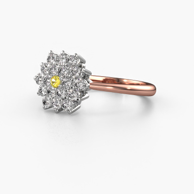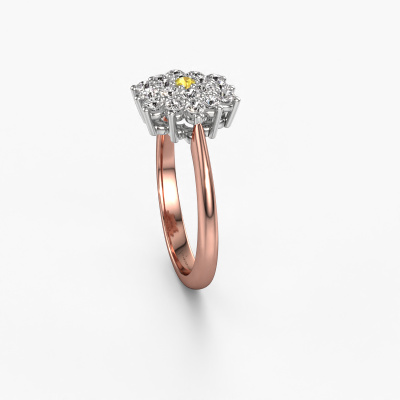 The ring shown above is called the Vickey. We call this type of ring a cluster ring, the centre gemstone is surrounded by smaller sized stones. This 14 Carat rose gold version is set with a 2 mm round yellow sapphire centre stone, embraced by smaller diamonds. The classic rose gold flower engagement ring stands out because of its shape. Together, the smaller and bigger sized yellow sapphire gemstones form a flower and they appear to collide into one big sparkling gem. This classic engagement ring is also known as the flower ring. Our expert Goldsmiths make sure the smaller diamonds stones are set identically so there is no light interference in the yellow sapphire but unity instead. With perfect precision and a skilful hand each yellow sapphire is set in the ring. During manufacturing, it is constantly monitored to make sure light reflects flawlessly. This results in a unique engagement ring, with a radiant yellow sapphire at its centre. A lovely, meaningful gift to bestow upon the love of your life. Because we design and deliver our own rings, we can offer you a engagement ring at a price you won't find anywhere else. A ring is made to order, which helps prevent excess supplies, so we can make you a great price offer. We understand it feels risky, buying your engagement ring online, but we will gladly assist in the designing process, taking your budget into consideration.Our designers and goldsmiths work together each day, creating new jewels. Perhaps you have found a nice classic engagement ring somewhere, which can be used to customize your unique ring. Please feel free to contact us. We will make you an offer, based on a fair price/ quality ratio, which will amaze you.To make it easier for you, we offer a 30 day return policy. Check our terms and conditions.