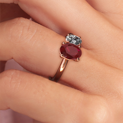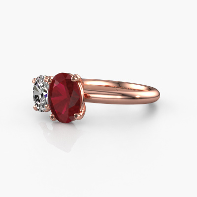 This 14 Carat rose gold ring is called Toi et Moi OVL-OVL and is set with ruby. How would you describe the style of the love of your life? Does she have a unique sense of style? This stunning sublime rose gold engagement ring can be custom-made to your own or her liking. Our ruby gemstones have been carefully selected because we believe your modern engagement ring must be adorned with nothing but the most beautiful gemstone. Don't you agree? This jewel is made by a team of passionate goldsmiths and jewel designers. This will make your crown jewel truly eye-catching.After receiving your order, our goldsmiths will start the creative process of making your Toi et Moi OVL-OVL engagement ring. We don't keep stock. This is advantageous because these costs will not be passed on to you. Therefore, we can offer jewellery at exceptionally low prices.Different styles of new rings are made daily by our team. Perhaps you have found a 2 stone engagement ring somewhere. One you would like to give to your loved one. Please feel free to share your thoughts and design with our jewel designers. We would love to turn your design into a modern engagement ring. You can follow the development of your ring design because we use very detailed 3D drawings. On top of that, you can order a dummy of the design. A dummy is a plastic ring, which can be shaped according your ring design. You can try it on and check if the engagement ring is up to standard. We will gladly send you a non-binding offer, based on a fair price/ quality ratio. The offer will baffle you, considering the quality of the ring and gemstones.To make it easier for you, we offer a 30 day return policy. Check our terms and conditions.