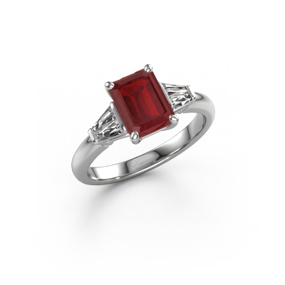 This platinum ring is called Kina EME and is set with ruby. How would you describe the style of the love of your life? Does she have a unique sense of style? This stunning special platinum engagement ring can be custom-made to your own or her liking. Our ruby gemstones have been carefully selected because we believe your exclusive engagement ring must be adorned with nothing but the most beautiful gemstone. Don't you agree? This jewel is made by a team of passionate goldsmiths and jewel designers. This will make your crown jewel truly eye-catching.Are you on a budget? Please feel free to contact us, so we can go discuss your options. We offer our engagement rings at guaranteed best price, because we make them to order. You won't find such a price anywhere else!Have you found a specific engagement ring somewhere which you would like to give to your loved one? Please feel free to express your wishes to our jewel designers because we would be honoured to turn your design into a exclusive engagement ring. You can follow the development of your ring design because we use 3D drawings. This gives you a realistic preview of how your design will look. You can also preorder a dummy. A dummy is a plastic ring, which can be shaped according your ring design. You can try it on and check if its width and size are suitable for you. We will gladly send you a non-binding offer, based on a fair price/ quality ratio. It will amaze you, considering the quality of the ring and gemstones.To make it easier for you, we offer a 30 day return policy. Check our terms and conditions.