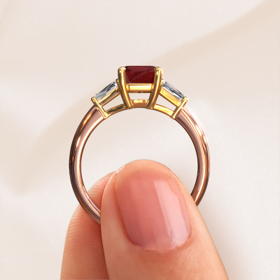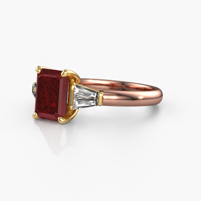 This 14 Carat rose gold ring is called Kina EME and is set with ruby. How would you describe the style of the love of your life? Does she have a unique sense of style? This stunning special rose gold engagement ring can be custom-made to your own or her liking. Our ruby gemstones have been carefully selected because we believe your exclusive engagement ring must be adorned with nothing but the most beautiful gemstone. Don't you agree? This jewel is made by a team of passionate goldsmiths and jewel designers. This will make your crown jewel truly eye-catching.Are you on a budget? Please feel free to contact us, so we can go discuss your options. We offer our engagement rings at guaranteed best price, because we make them to order. You won't find such a price anywhere else!Have you found a specific engagement ring somewhere which you would like to give to your loved one? Please feel free to express your wishes to our jewel designers because we would be honoured to turn your design into a exclusive engagement ring. You can follow the development of your ring design because we use 3D drawings. This gives you a realistic preview of how your design will look. You can also preorder a dummy. A dummy is a plastic ring, which can be shaped according your ring design. You can try it on and check if its width and size are suitable for you. We will gladly send you a non-binding offer, based on a fair price/ quality ratio. It will amaze you, considering the quality of the ring and gemstones.To make it easier for you, we offer a 30 day return policy. Check our terms and conditions.