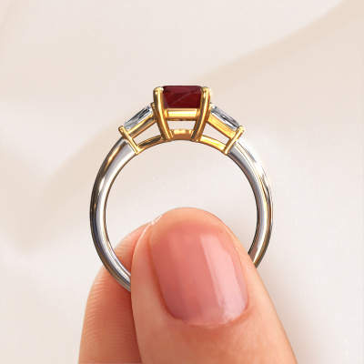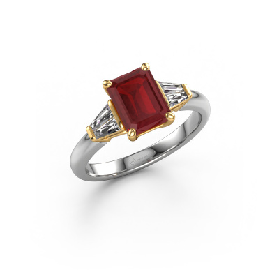 This 14 Carat white gold ring is called Kina EME and is set with ruby. How would you describe the style of the love of your life? Does she have a unique sense of style? This stunning special white gold engagement ring can be custom-made to your own or her liking. Our ruby gemstones have been carefully selected because we believe your exclusive engagement ring must be adorned with nothing but the most beautiful gemstone. Don't you agree? This jewel is made by a team of passionate goldsmiths and jewel designers. This will make your crown jewel truly eye-catching.Are you on a budget? Please feel free to contact us, so we can go discuss your options. We offer our engagement rings at guaranteed best price, because we make them to order. You won't find such a price anywhere else!Have you found a specific engagement ring somewhere which you would like to give to your loved one? Please feel free to express your wishes to our jewel designers because we would be honoured to turn your design into a exclusive engagement ring. You can follow the development of your ring design because we use 3D drawings. This gives you a realistic preview of how your design will look. You can also preorder a dummy. A dummy is a plastic ring, which can be shaped according your ring design. You can try it on and check if its width and size are suitable for you. We will gladly send you a non-binding offer, based on a fair price/ quality ratio. It will amaze you, considering the quality of the ring and gemstones.To make it easier for you, we offer a 30 day return policy. Check our terms and conditions.