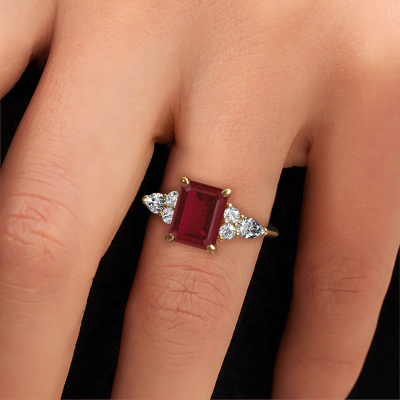 This 14 Carat gold ring is called Melani EME and is set with ruby. How would you describe the style of the love of your life? Does she have a unique sense of style? This stunning sublime gold promise ring can be custom-made to your own or her liking. Our ruby gemstones have been carefully selected because we believe your contemporary promise ring must be adorned with nothing but the most beautiful gemstone. Don't you agree? This jewel is made just for you, with attention to detail and design.Are you on a budget? Please feel free to contact us, so we can go discuss your options. We offer our promise ring at guaranteed best price, because we make them to order. You won't find such a price anywhere else!Do you have a specific ring in mind? One you came across somewhere. Please feel free to tell us your wishes and we will turn your design into a unique promise ring. You can follow the development of your ring design because we use 3D drawings. This gives you a realistic preview of your design. We will gladly send you a non-binding offer, based on a fair price/ quality ratio. It will amaze you.To make it easier for you, we offer a 30 day return policy. Check our terms and conditions.