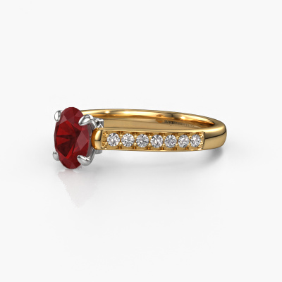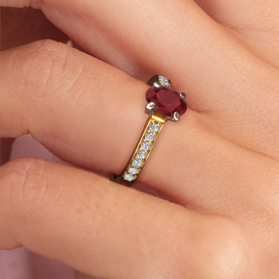 The ring shown above is called the Valorie ovl 2. We call this type of ring a pavé solitaire ring because it has one centre gemstone and a band that is also pave set with gemstones. This engagement ring is made in 14 Carat gold set with a 7x5 mm oval ruby, and pave set lab-grown diamonds at the sides. Each piece of jewellery is made with passion and love by one of our master goldsmiths.This fashionable gold pavé solitaire engagement ring has an exquisite oval ruby centre stone. To further accentuate the centre stone, the band is set full with more lab-grown diamonds. Its open prong setting allows light to strike the ruby from various angles and this adds sparkle to your ruby ring. The photo shown above depicts the goldsmith's carefully handcrafted details of the ring. The high positioning of the centre stone is truly eye-catching. The perfect engagement ring for the crown jewel of your life!Are you on a budget? Please feel free to contact us, so we can go discuss your options. We offer our engagement rings at guaranteed best price, because we make them to order. You won't find such a price anywhere else!Our team adds new designs to our online collection daily. Our designers and goldsmiths work together in creating the best design. We strive to offer a diverse collection of jewels. Perhaps you have a specific jewel design in mind. One you came across somewhere. Please contact us for a free consultation. We will make you an offer, based on a fair price/ quality ratio, that will baffle you.To make it easier for you, we offer a 30 day return policy. Check our terms and conditions.