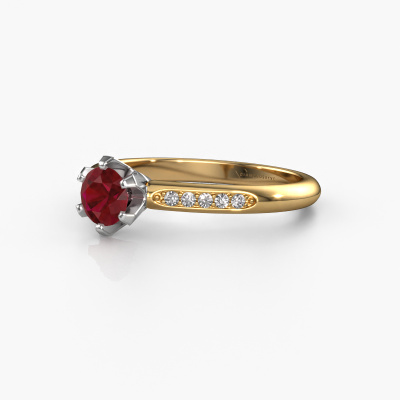 The ring shown above is called the Tiffy 2. We call this type of ring a pavé solitaire ring because it has one centre gemstone and a band that is also pave set with gemstones. This engagement ring is made in 14 Carat gold set with a 4.7 mm round ruby, and pave set diamonds at the sides. Each piece of jewellery is created to add sparkle to your finger, each jewel is lovingly made by hand by our goldsmiths.This traditional gold pavé solitaire engagement ring has an exquisite round ruby centre stone. To further accentuate the centre stone, the band is set full with more diamonds. Its open prong setting allows light to strike the ruby from various angles and this adds sparkle to your ruby ring. The photo shown above depicts the goldsmith's carefully handcrafted details of the ring. The high positioning of the centre stone is truly eye-catching. The perfect engagement ring for the crown jewel of your life!By using our modern techniques, we can design and customize the finest quality jewels with the utmost care for you. Our engagement rings are always priced 30 percent lower than other jewellers. We make engagement rings to order so we don't have to maintain a large stock. If you have a certain budget, we are more than happy to advice you accordingly.Our designers and goldsmiths work together each day, creating new jewels. Perhaps you have found a nice traditional engagement ring somewhere, which can be used to customize your unique ring. Please feel free to contact us. We will make you an offer, based on a fair price/ quality ratio, which will amaze you.To make it easier for you, we offer a 30 day return policy. Check our terms and conditions.