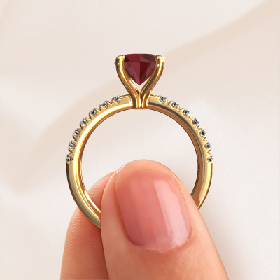 The ring shown above is called the Crystal RND 2. We call this type of ring a pavé solitaire ring because it has one centre gemstone and a band that is also pave set with gemstones. The 14 Carat gold engagement ring is set with a round 7.3 mm ruby centre stone and the band is pave set with lab grown diamond gemstones. Each jewel is unique in every way! Simply customize to your liking,This classic gold pavé solitaire engagement ring has an exquisite round ruby centre stone. To further accentuate the centre stone, the band is fully set with more lab-grown diamonds. Its open prong setting allows light to strike the ruby from various angles and this adds sparkle to your ruby ring. The photo shown above depicts the goldsmith's carefully handcrafted details of the ring. The high positioning of the centre stone is truly eye-catching. The perfect engagement ring for the crown jewel of your life! After receiving your order, our goldsmiths will start the creative process of making your Crystal RND 2 engagement ring. We don't keep stock. This is advantageous because these costs will not be passed on to you. Therefore, we can offer jewellery at exceptionally low prices.Different styles of new rings are made daily by our team. Perhaps you have found a pavé solitaire engagement ring somewhere. One you would like to give to your loved one. Please feel free to share your thoughts and design with our jewel designers. We would love to turn your design into a classic engagement ring. You can follow the development of your ring design because we use very detailed 3D drawings. On top of that, you can order a dummy of the design. A dummy is a plastic ring, which can be shaped according your ring design. You can try it on and check if the engagement ring is up to standard. We will gladly send you a non-binding offer, based on a fair price/ quality ratio. The offer will baffle you, considering the quality of the ring and gemstones.To make it easier for you, we offer a 30 day return policy. Check our terms and conditions.