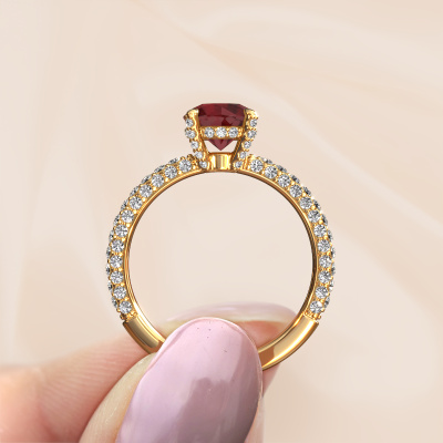 The ring shown above is called the Saskia rnd 2. We call this type of ring a pavé solitaire ring because it has one centre gemstone and a band that is also pave set with gemstones. The 14 Carat gold engagement ring is set with a round 7 mm ruby centre stone and the band is pave set with lab grown diamond gemstones. Each jewel is made by a team of passionate goldsmiths and jewel designers. This will make your crown jewel truly eye-catching.This exclusive gold pavé solitaire engagement ring has an exquisite round ruby centre stone. To further accentuate the centre stone, the band is fully set with more lab-grown diamonds. Its open prong setting allows light to strike the ruby from various angles and this adds sparkle to your ruby ring. The photo shown above depicts the goldsmith's carefully handcrafted details of the ring. The high positioning of the centre stone is truly eye-catching. The perfect engagement ring for the crown jewel of your life! After receiving your order, our goldsmiths will passionately start the creative process of making your engagement ring in our own studio. Because we don't have a big stockpile, these costs will not be passed on to you. Our pricing is proof of that! We offer top quality jewels at lowest price, guaranteed.Our team adds new designs to our online collection daily. Our designers and goldsmiths work together in creating the best design. We strive to offer a diverse collection of jewels. Perhaps you have a specific jewel design in mind. One you came across somewhere. Please contact us for a free consultation. We will make you an offer, based on a fair price/ quality ratio, that will baffle you.To make it easier for you, we offer a 30 day return policy. Check our terms and conditions.