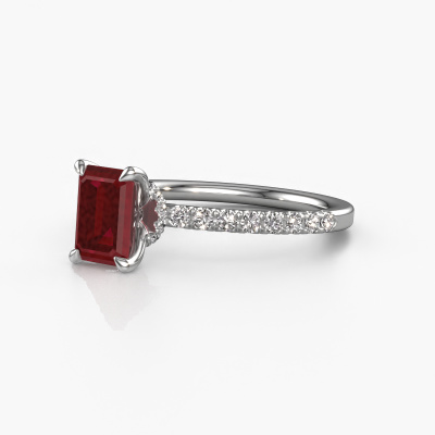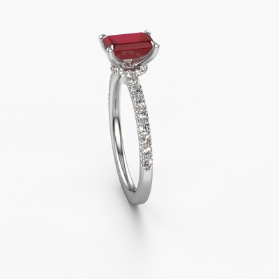 The ring shown above is called the Crystal EME 4. We call this type of ring a pavé solitaire ring because it has one centre gemstone and a band that is also pave set with gemstones. The platinum engagement ring is set with a emerald cut 7x5 mm ruby centre stone and the band is pave set with lab grown diamond gemstones. Each jewel is created to add sparkle to your finger, each jewel is lovingly made by hand by our goldsmiths.This fashionable platinum pavé solitaire engagement ring has an exquisite emerald cut ruby centre stone. To further accentuate the centre stone, the band is fully set with more lab-grown diamonds. Its open prong setting allows light to strike the ruby from various angles and this adds sparkle to your ruby ring. The photo shown above depicts the goldsmith's carefully handcrafted details of the ring. The high positioning of the centre stone is truly eye-catching. The perfect engagement ring for the crown jewel of your life! After receiving your order, our goldsmiths will passionately start the creative process of making your engagement ring in our own studio. Because we don't have a big stockpile, these costs will not be passed on to you. Our pricing is proof of that! We offer top quality jewels at lowest price, guaranteed.Our team adds new designs to our online collection daily. Our designers and goldsmiths work together in creating the best design. We strive to offer a diverse collection of jewels. Perhaps you have a specific jewel design in mind. One you came across somewhere. Please contact us for a free consultation. We will make you an offer, based on a fair price/ quality ratio, that will baffle you.To make it easier for you, we offer a 30 day return policy. Check our terms and conditions.