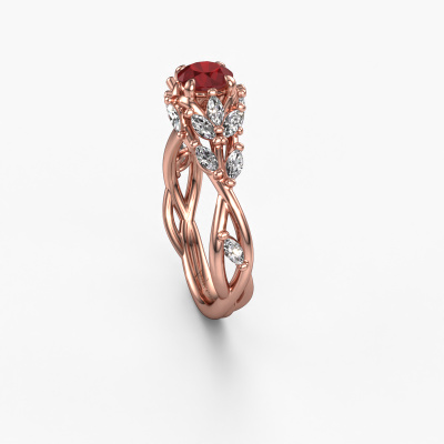 The ring shown above is called the Samantha RND. We call this type of ring a pavé solitaire ring because it has one centre gemstone and a band that is also pave set with gemstones. This engagement ring is made in 14 Carat rose gold set with a 5 mm round ruby, and pave set diamonds at the sides. Each piece of jewellery is made with passion and love by one of our master goldsmiths.This contemporary rose gold pavé solitaire engagement ring has an exquisite round ruby centre stone. To further accentuate the centre stone, the band is set full with more diamonds. Its open prong setting allows light to strike the ruby from various angles and this adds sparkle to your ruby ring. The photo shown above depicts the goldsmith's carefully handcrafted details of the ring. The high positioning of the centre stone is truly eye-catching. The perfect engagement ring for the crown jewel of your life!By using a combination of the latest modern techniques, combined with ancient crafting, we can make all our engagement rings in our own studio. Each jewel is made to order. This is advantageous because we can offer you a price you won't find anywhere else.Our designers and goldsmiths work together each day, creating new jewels. Perhaps you have found a nice contemporary engagement ring somewhere, which can be used to customize your unique ring. Please feel free to contact us. We will make you an offer, based on a fair price/ quality ratio, which will amaze you.To make it easier for you, we offer a 30 day return policy. Check our terms and conditions.